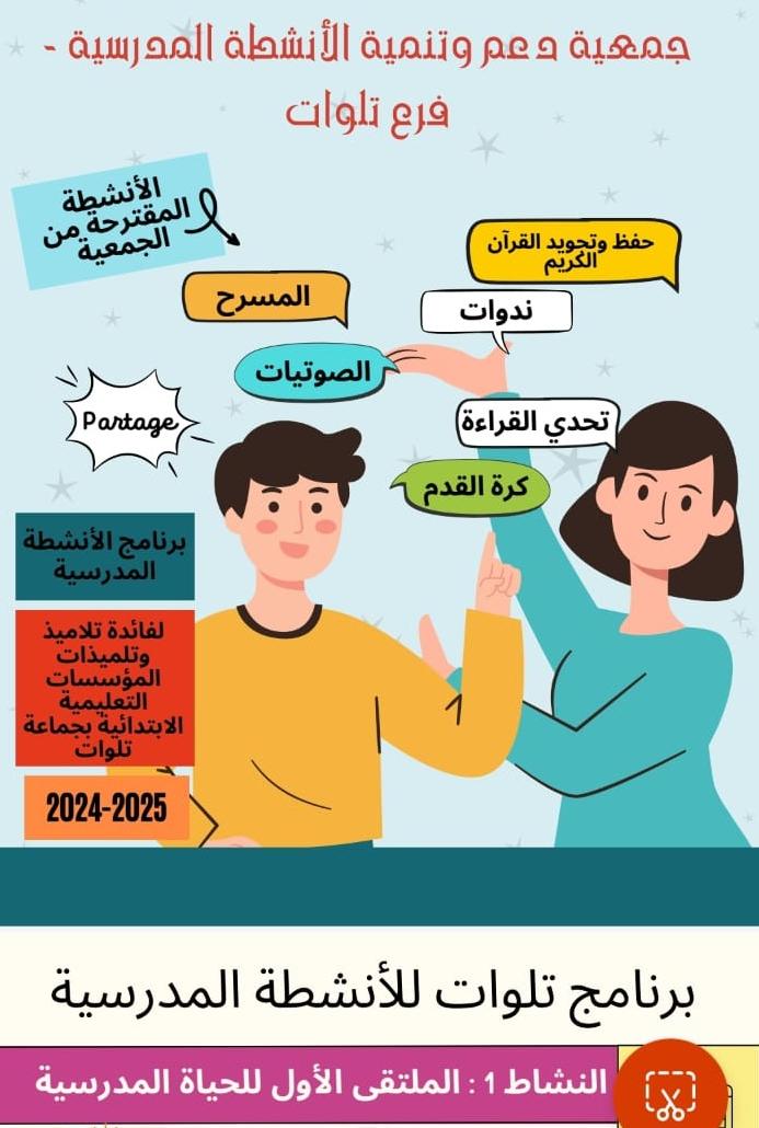 تحت شعار “تعزيز حياة مدرسية إيجابية من أجل بناء مجتمع تعليمي متماسك”، تنسيق الإطار التربوي إيدار حيدي، تنظم جمعية دعم وتنمية الأنشطة المدرسية-فرع تلوات، بشراكة مع مجلس جماعة تلوات، يوم السبت 15 فبراير الجاري، الملتقى الأول للحياة المدرسة.