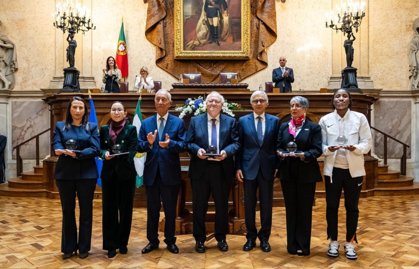 وسلم الجائزة للمتوكل وباقي المحتفى بهم رئيس الجمهورية البرتغالية، مارسيلو ريبيلو ذا سوزا، ورئيس الجمعية الوطنية الجمهورية البرتغالية، خوسيه بيدرو أغيار-برانكو، اليوم الأربعاء بمقر البرلمان البرتغالي، بحضور شخصيات بارزة تنتمي لعوالم السياسة، الأعمال، الفنون والإعلام.