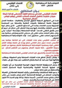 وفي السياق ذاته، أعلن الاتحاد الإقليمي رفضه القاطع لهذه القرارات، مطالبا بإلغائها فورا وإرجاع الأعضاء المنقولين إلى مناصبهم الأصلية دون قيد أو شرط. كما حمل الجهات الوصية إقليميا مسؤولية ما قد يترتب عن إستمرار ما وصفه بـ”التعنت والإستفزاز” من قبل إدارة الشركة.