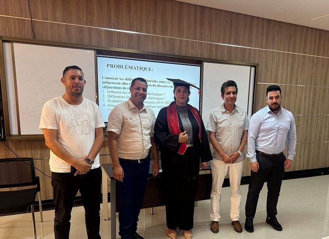 بهدوء الباحثة كما وصفها أستاذها الدكتور محسن إدالي، وبتواضع من يعرف أن طريق العلم رحلة لا تنتهي، عرضت يسرى أمام اللجنة ملامح عملها الذي اشتغل على تقاطع الإعلام والهجرة، من خلال تحليل نقدي مقارن لخطابين صحفيين ينتميان إلى فضائين مختلفين سياسيًا وثقافيًا وجغرافيًا. لم يكن هدفها فقط رصد الكلمات أو الصور أو العناوين، بل الغوص في ما وراء النص: كيف يُبنى المهاجر في المخيال الجماعي من خلال اللغة؟ كيف يمكن لخط تحريري أن يصنع تصورات جمعية حول “الآخر”؟ ومتى يصبح الإعلام أداة لبناء الجسور أو تغذية الجدران؟