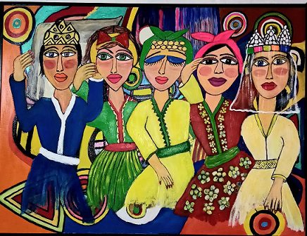 اللوحة تحمل طابعًا فنيًا تعبيريًا قويًا، حيث نلاحظ تصويرًا لخمس نساء يرتدين أزياء تقليدية ملونة، كل واحدة منهن تحمل تعبيرًا خاصًا يعكس مزيجًا من الفخر، التأمل، والأنوثة المتجذرة في التراث… قراءتي الفنية والتأملية للوحة: