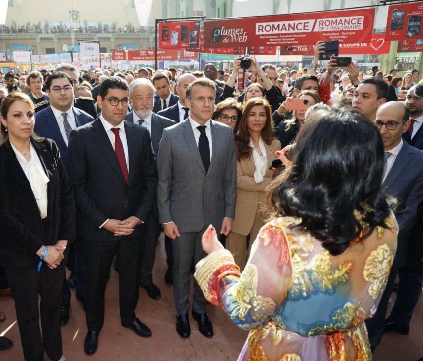 وبعد تحية العلم على نغمات النشيدين الوطنيين للبلدين، اللذين أدتهما المطربة المغربية نبيلة معان، زار ماكرون مختلف أركان الجناح المغربي، الذي صُمم ليكون فضاء غامرا يحتفي بثراء وتنوع الكتاب المغاربة.